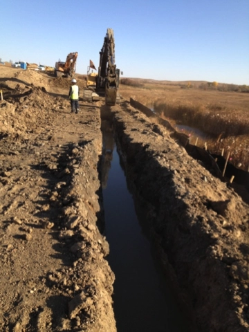 The site is adjacent to a natural gas pipeline corridor near Tioga, North Dakota. A leak of crude petroleum from wet gas was observed on the ground and creek surface. Earth Systems performed assessment with direct push technology to generally locate the source. Excavation to expose the buried piping and pressure testing were used to pinpoint the leak.